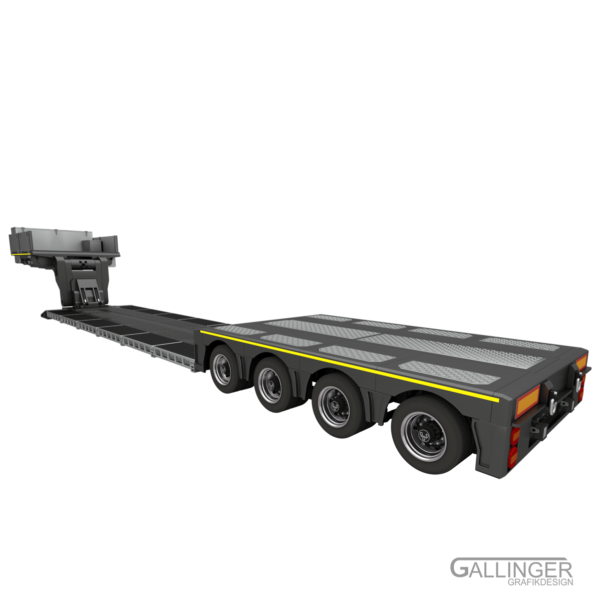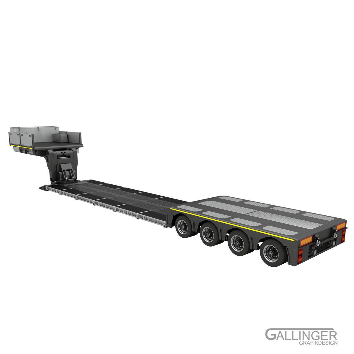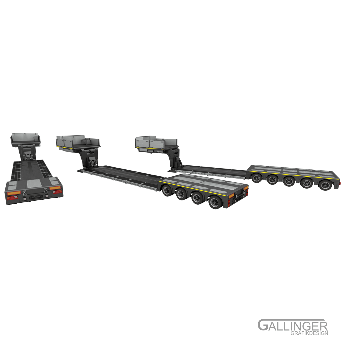 Hier ist das Spitzenmodell “Schwerlast Tiefbett Auflieger” zu sehen, das vielfältige Konfigurationsmöglichkeiten mit sich bringt.