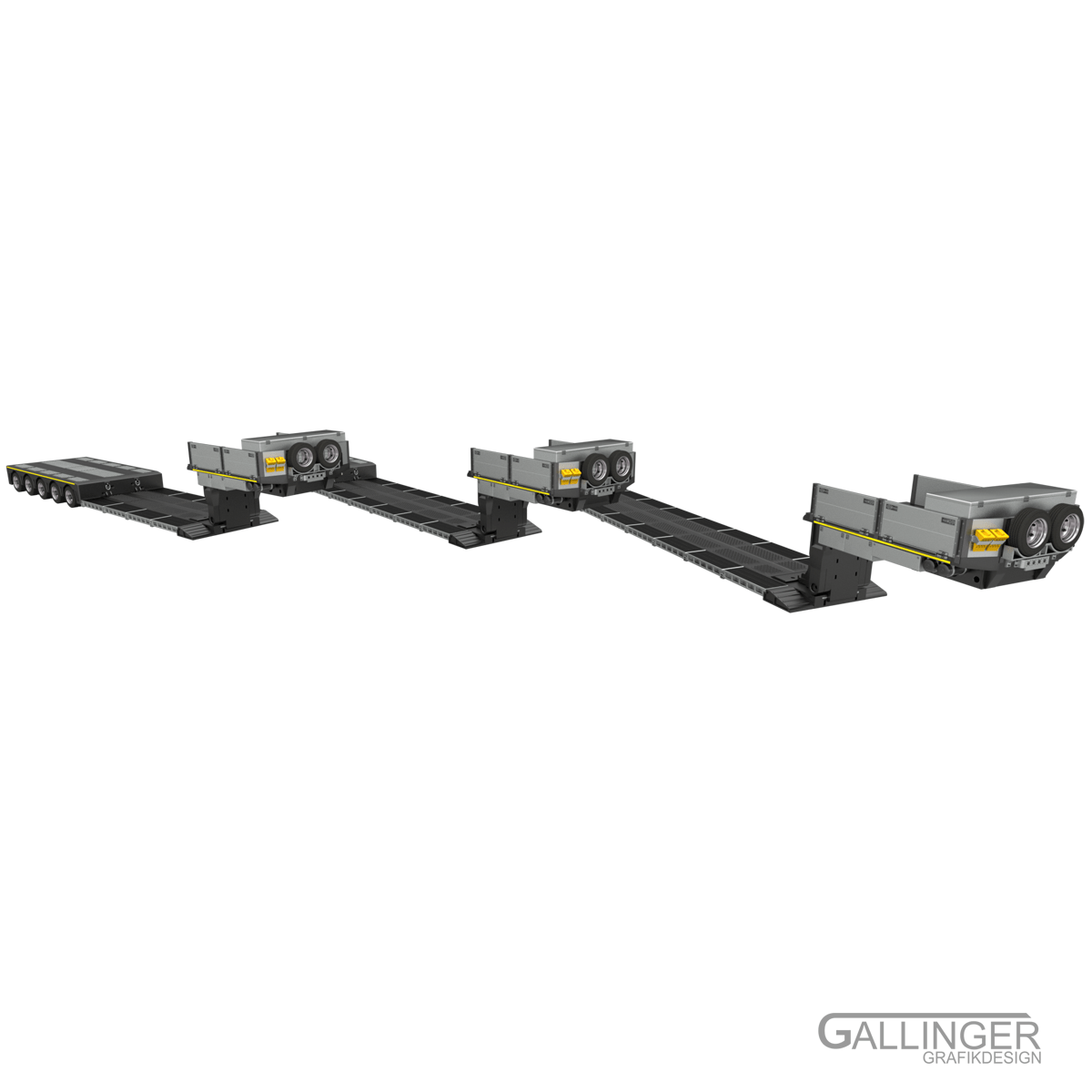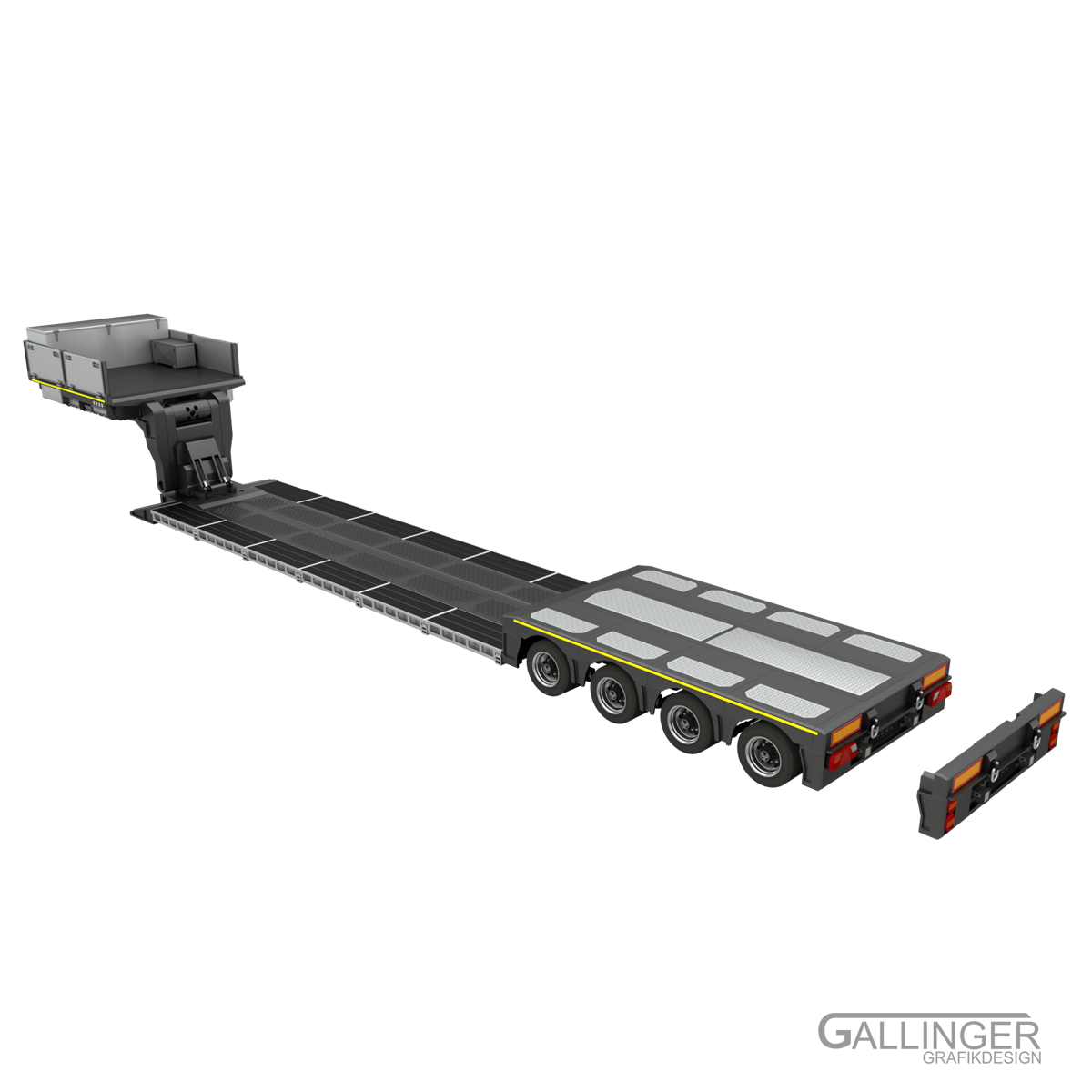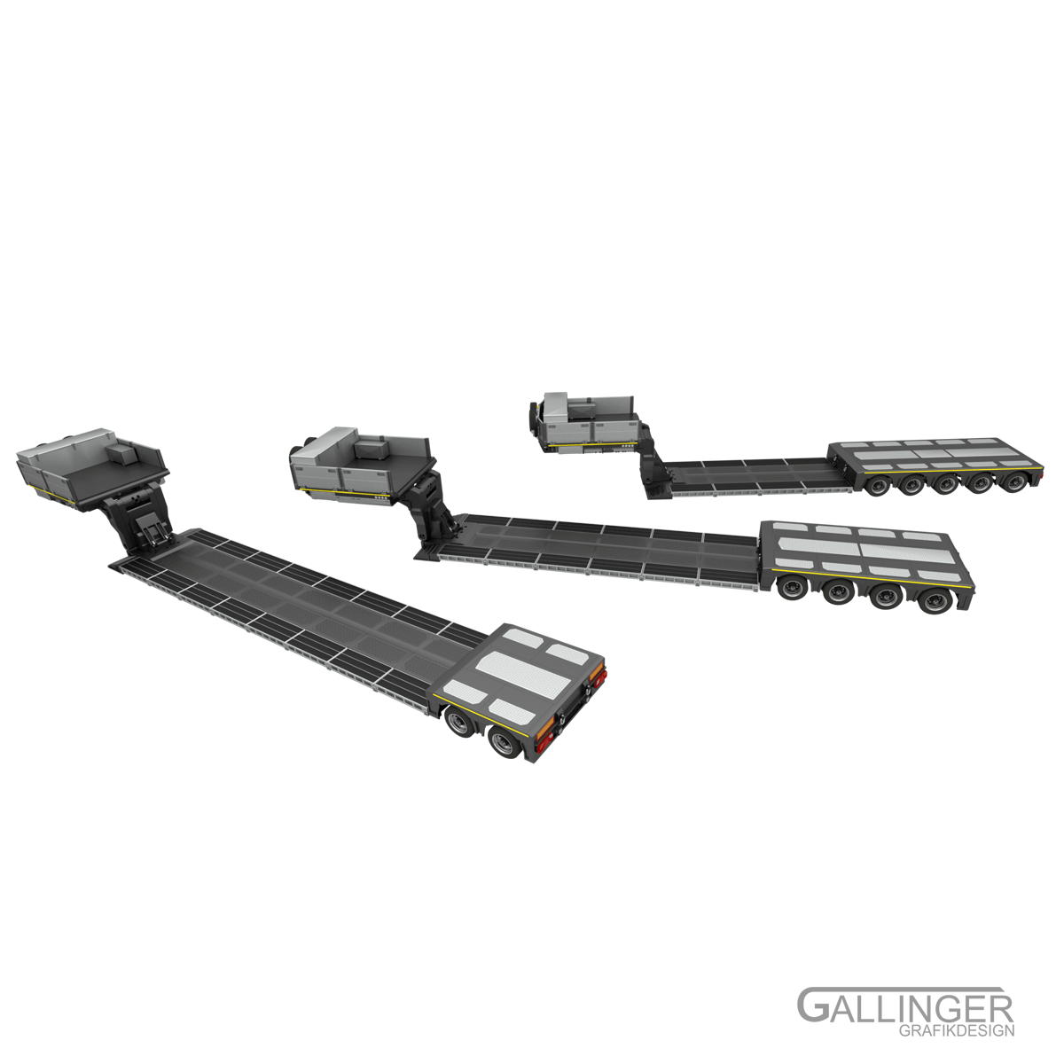 Hier ist das Spitzenmodell “Schwerlast Tiefbett Auflieger” zu sehen, das vielfältige Konfigurationsmöglichkeiten mit sich bringt.
