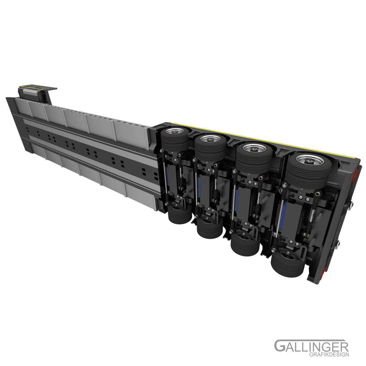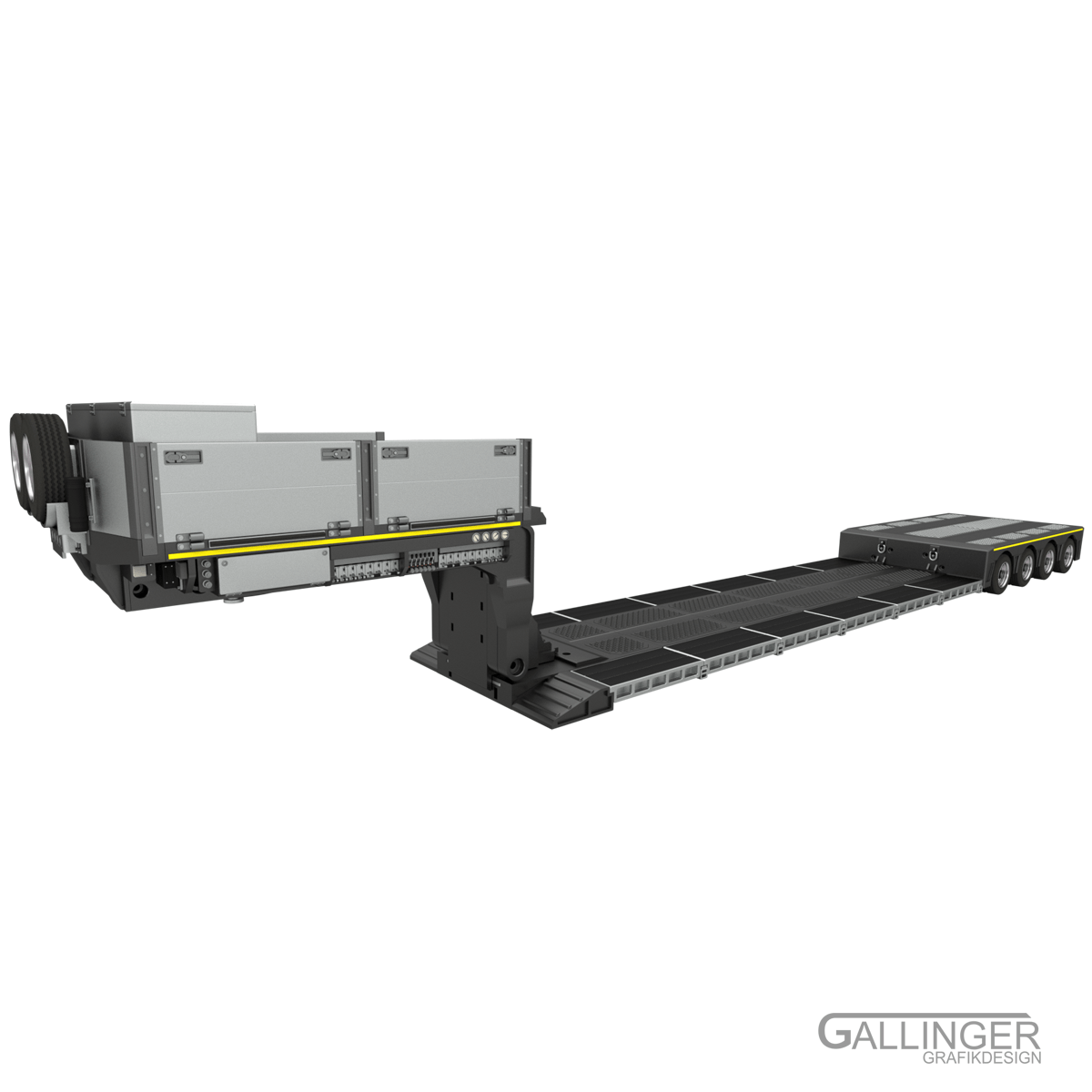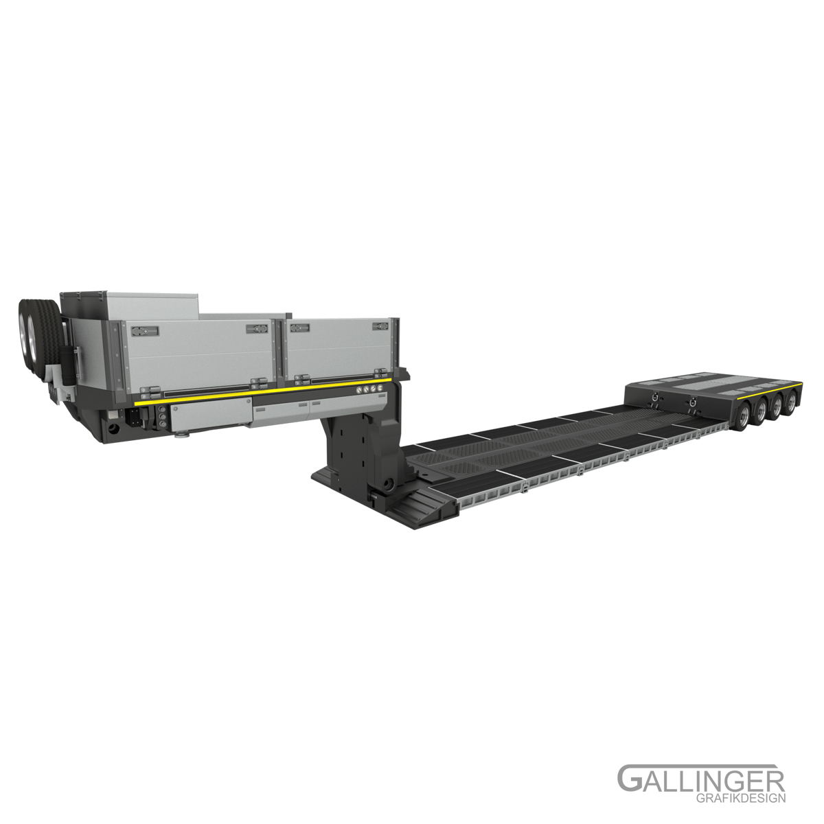 Der Hub der Ladegüter erfolgt mittels Kombination von Achsmodul und Schwanenhals. Darüber hinaus wird die Lastfähigkeit des Tiefladers damit ermöglicht.