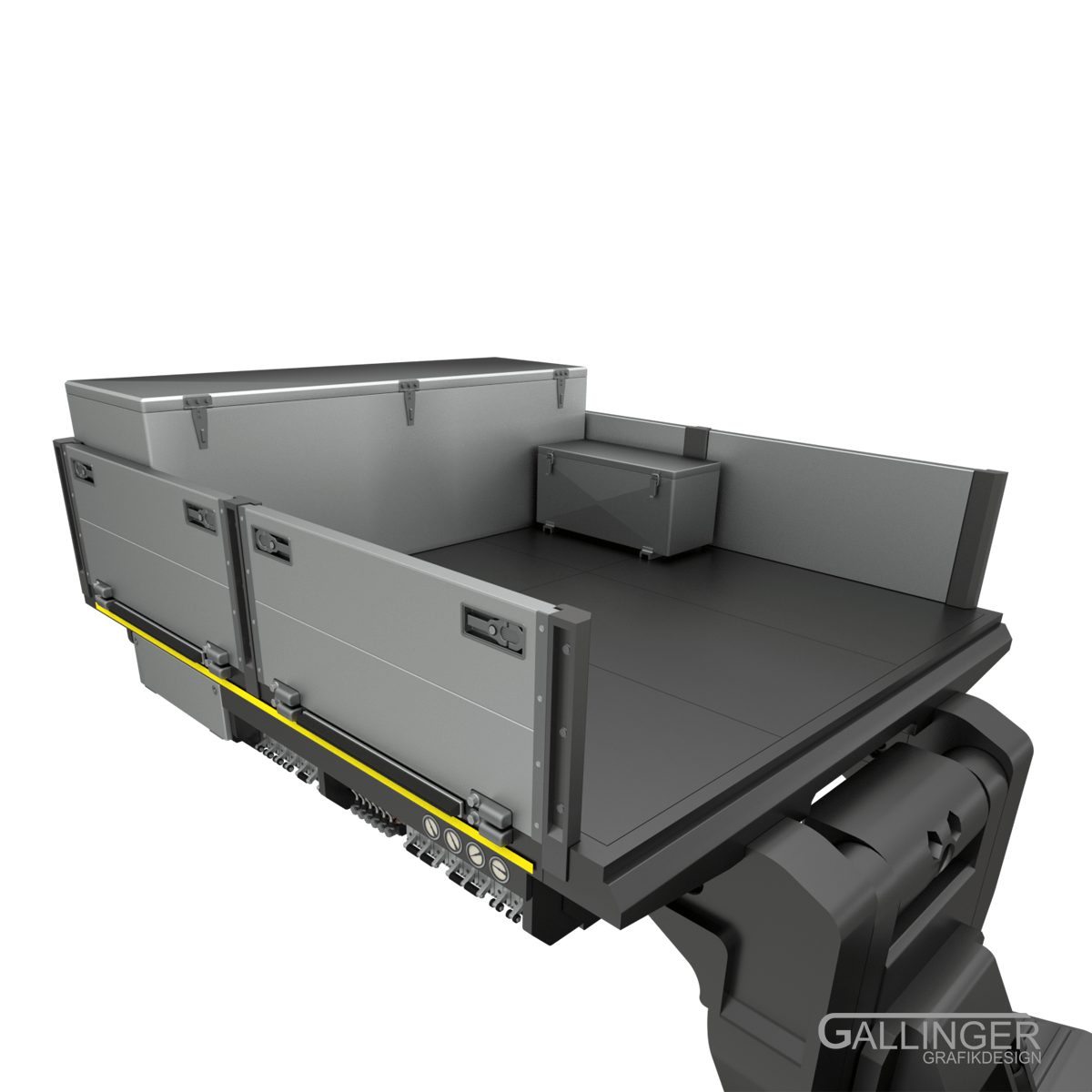 welche am hinteren Ende der Ladebrücke im Achsmodul münden und mit diesem fest verschraubt werden.